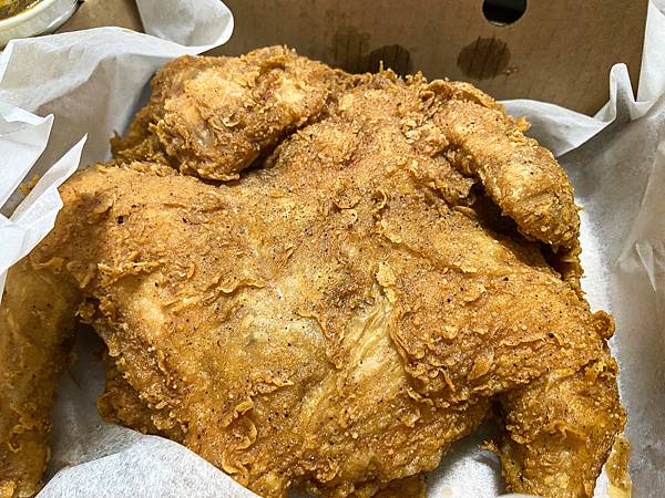 雞的大小跟市面烤雞尺寸差不多,肉質還可以完全不柴,但沒有到胖老爹的多汁程度,這個套餐附上了三種醬料,像在吃韓式半半炸雞,整隻雞光吃原味不沾醬就很好吃,但不是很適合手撕雞的吃法,不然就會整片皮一起被帶走,但在暴力拆解雞肉的過程還是很有爽感,你們都是怎麼拆解一隻雞的呢?(分解的太開心了~忘了注意有沒有雞屁股了)