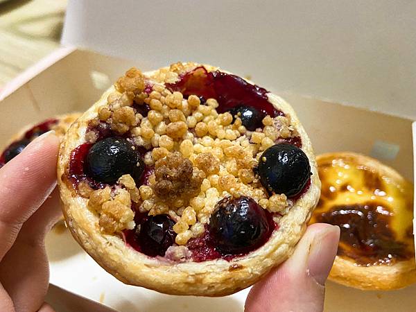 蔓越莓的酸味滿重的很是提味,蛋撻表面鋪著一層顆粒型的奶酥,內裡夾著卡士達內餡,可少了原有蛋塔的蛋香,又酸又酥又軟三種口感,我自己覺得吃起來很複雜,吃完只會更想念原味蛋撻,雖然每次吃完「期間限定口味」,都沒有原味來的好吃,但還是會忍不住期待新口味