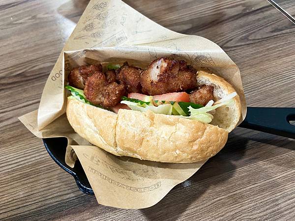 這個超好吃的,有驚豔到我,泰式醬配得很剛好,麵包很香我很喜歡ㄟ,但短棍偏硬不推薦給小朋友食用,我女兒光吃肉,配料給我吃光光~